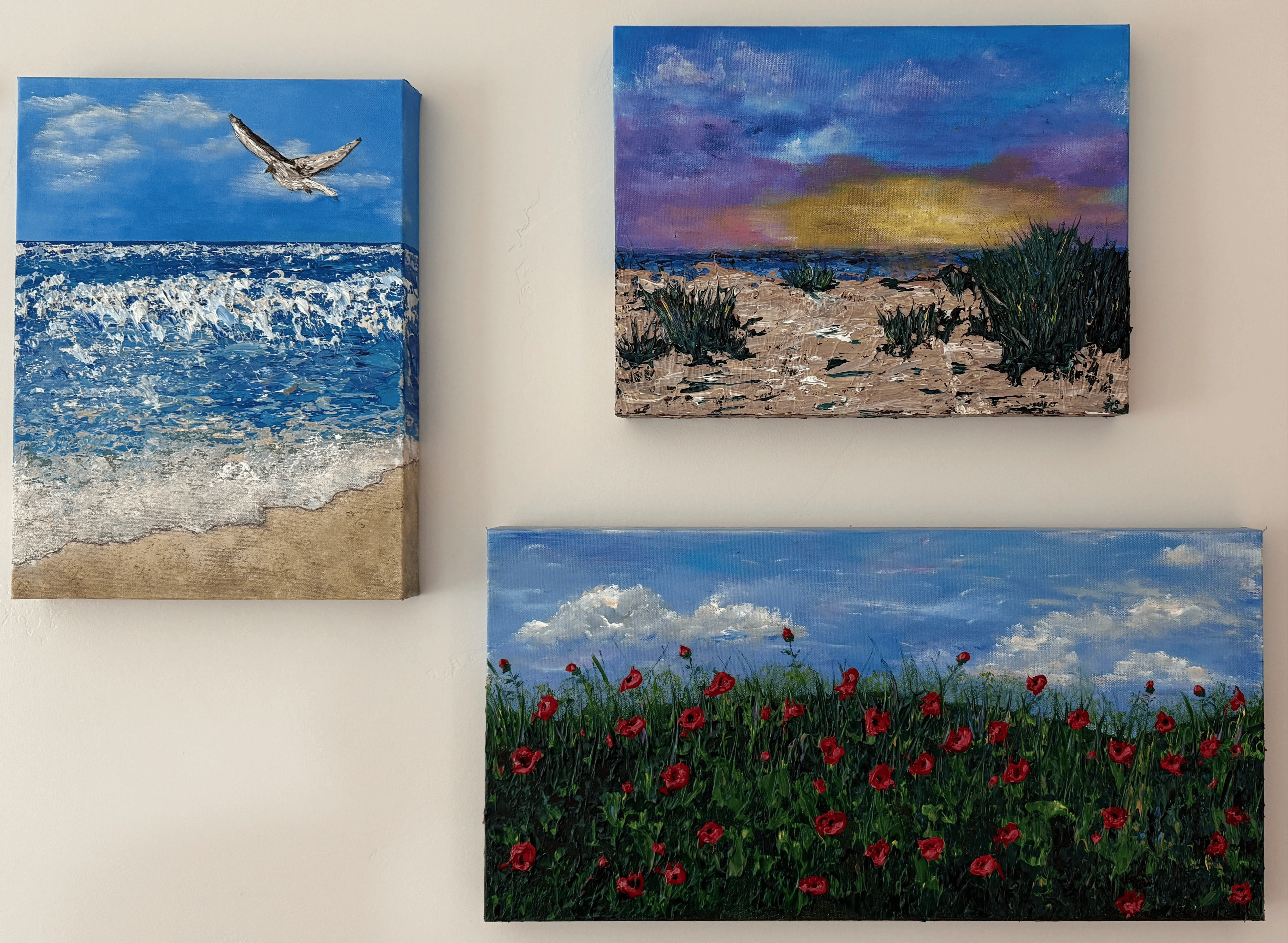 Kathy told me what she loves most is the sense of accomplishment—going from staring at that intimidating white canvas to stepping back and seeing a finished piece. Even when a painting doesn’t turn out as expected, she views it as a “learning piece.” She also loves trying new techniques, like painting palm trees, waves, and lavender fields, and weaving them into future creations. That’s exactly the adventurous spirit that keeps an artist growing.
