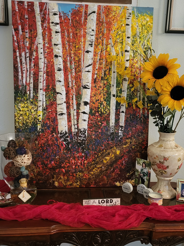 The painting Malu chose to share is especially meaningful to her. It’s inspired by one of the aspen tree paintings she first saw in my ads — the very moment she discovered my work. She had dreamed of painting a large aspen tree canvas, and now that painting lives as the central focal point in her living room. I mean, how amazing is that? Art that starts as inspiration and ends up becoming part of your everyday life.