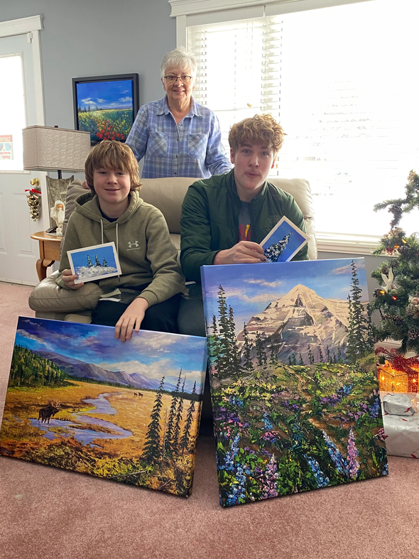 One final piece of Sheila’s story that I absolutely had to share is the joy she finds in gifting her artwork. Under a photo of her giving two paintings to her grandsons, she spoke about what a pleasure it has been to gift so many of her paintings to family. The “Leaving a Legacy” message of Let’s Dabble felt especially meaningful as the boys prepared to move into their new home after Christmas, excited to hang the paintings in their bedrooms. That, right there, is legacy in its most beautiful form.