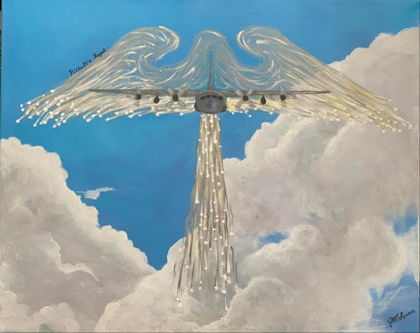 I chose this painting of an HC-130, the plane my brother-in-law flew as a special ops pilot (it was a gift for him), but my dad also flew C-130’s as a career AF pilot. I loved flying with my dad. He would say, “Just look at those clouds, Jan!” When he had dementia, he didn’t remember being a pilot, or who I was, but every day I saw him he’d look outside & say, “Just look at those clouds!”